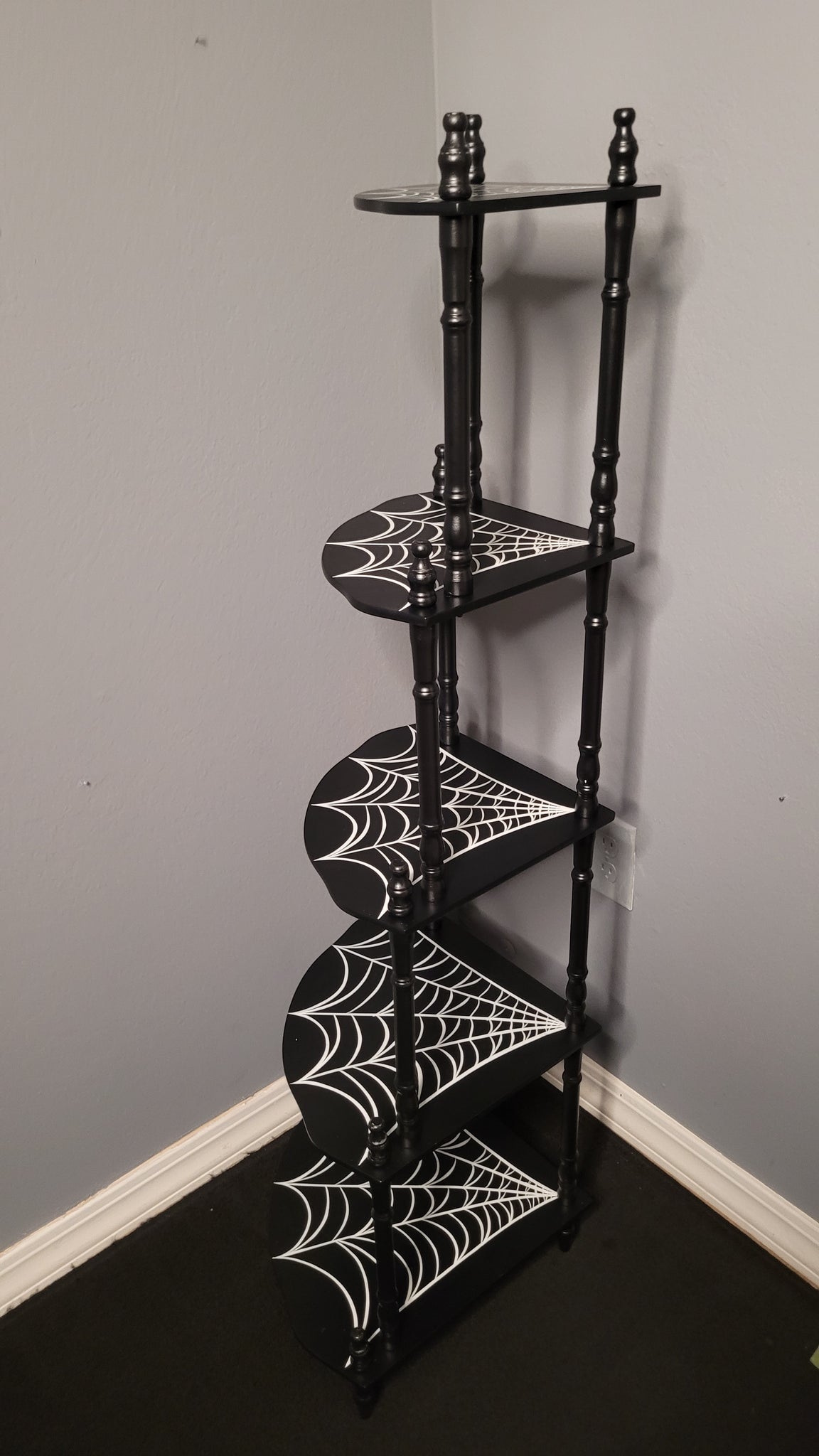 Our New Cobweb Corner Shelf measures 47.57 x 20 x 14.5 x in. Perfect for displaying your collectibles. Black Base with white pinstriped webs by our House artist @mannymurders A Matte top coat is applied to protect pinstriping. Assembly required. 7-10 days for your order to ship.