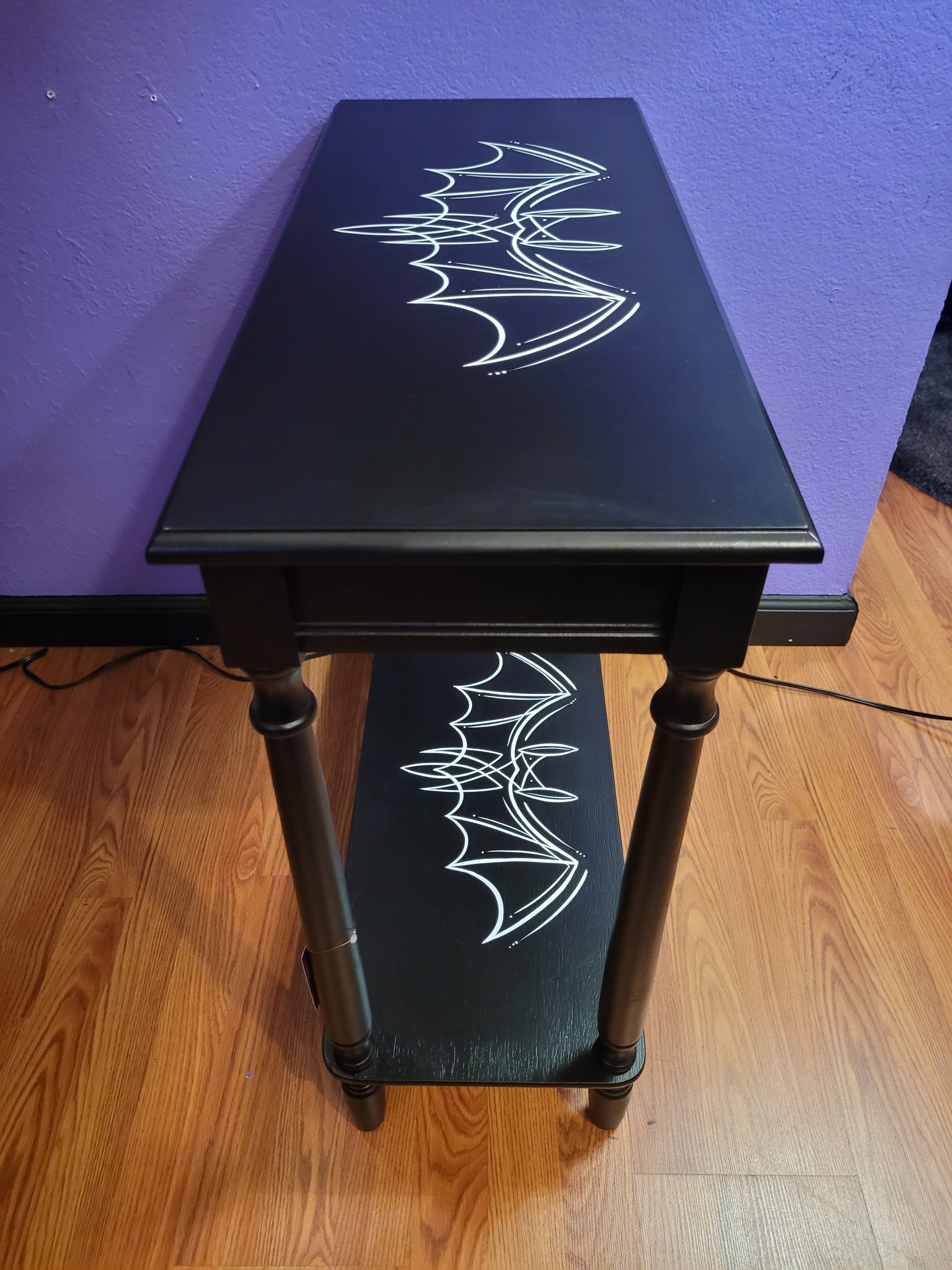 Black accent  table with Pinstriped White Bat. Wooden table measures 11.8 W x 28.25 xL 28.25 H inches . Ships unassembled. Hand painted and pinstriped by Manny Murders .Please Allow up 7-10 days for order to be completed.